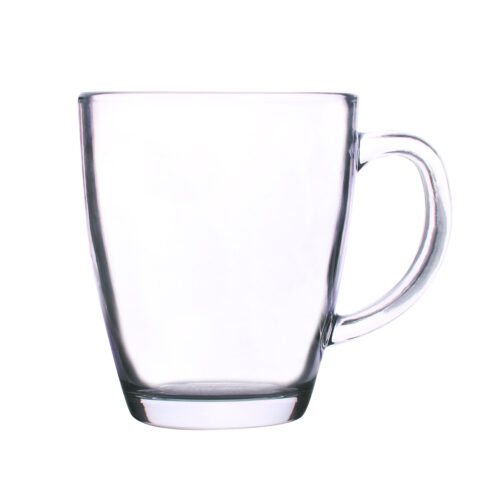 Glazen mok met ronde vorm en ergonomisch oor. Gemaakt van dik glas, heeft een stabiele basis.