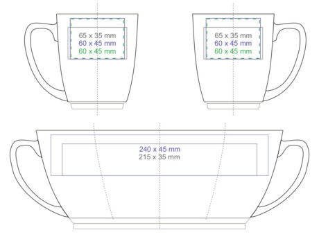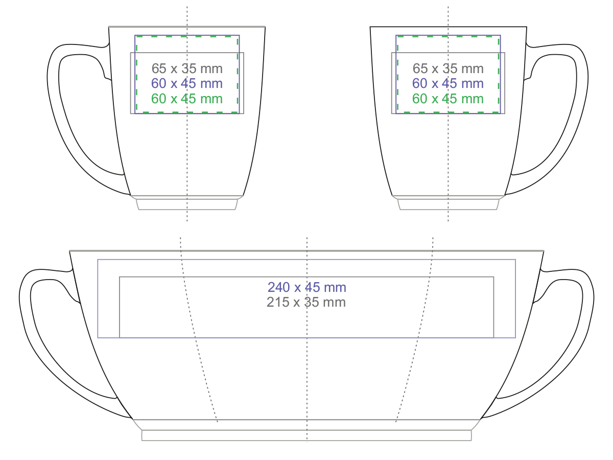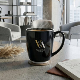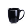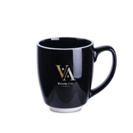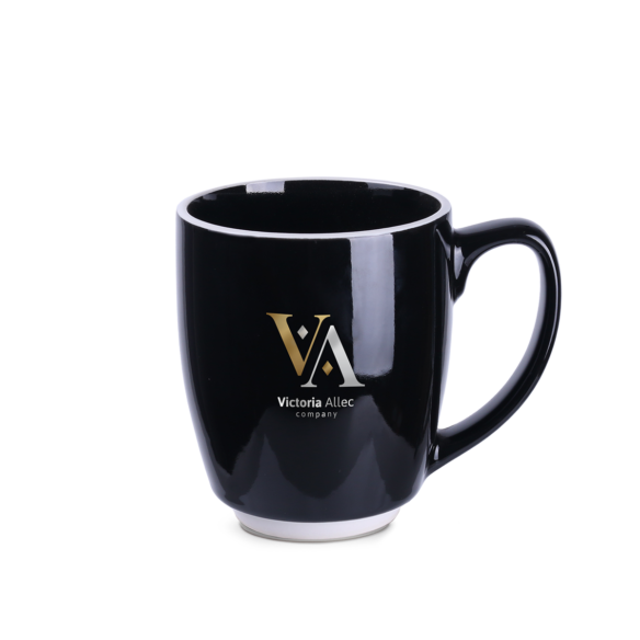 Designer zwarte reclamemok met ronde vorm en karakteristieke witte afwerkingen aan de rand en onderaan. Model met grote inhoud.