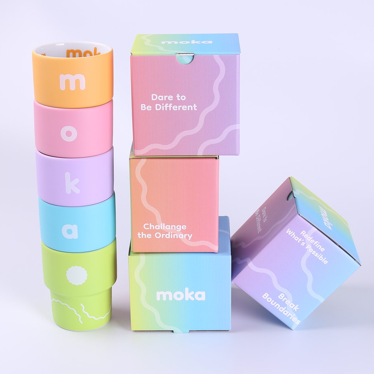 Mok in retrostijl, verkrijgbaar in verschillende kleurversies. De unieke vorm maakt het mogelijk het product te stapelen, waardoor ruimte wordt bespaard en interessante sets kunnen worden gecreëerd.