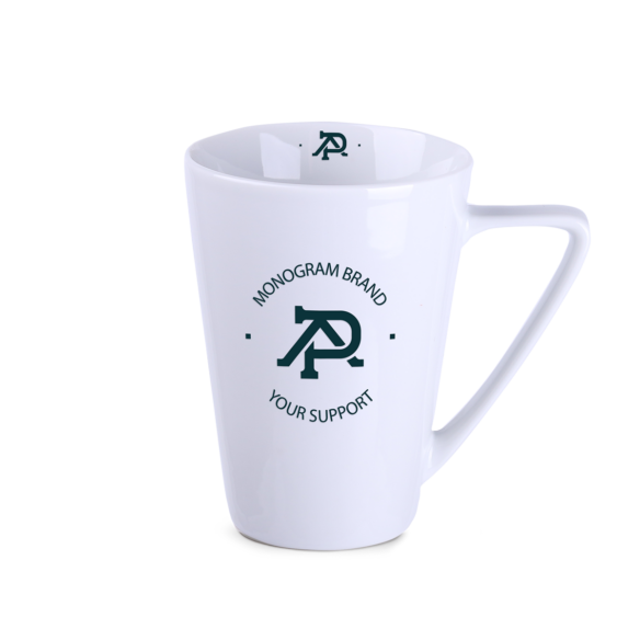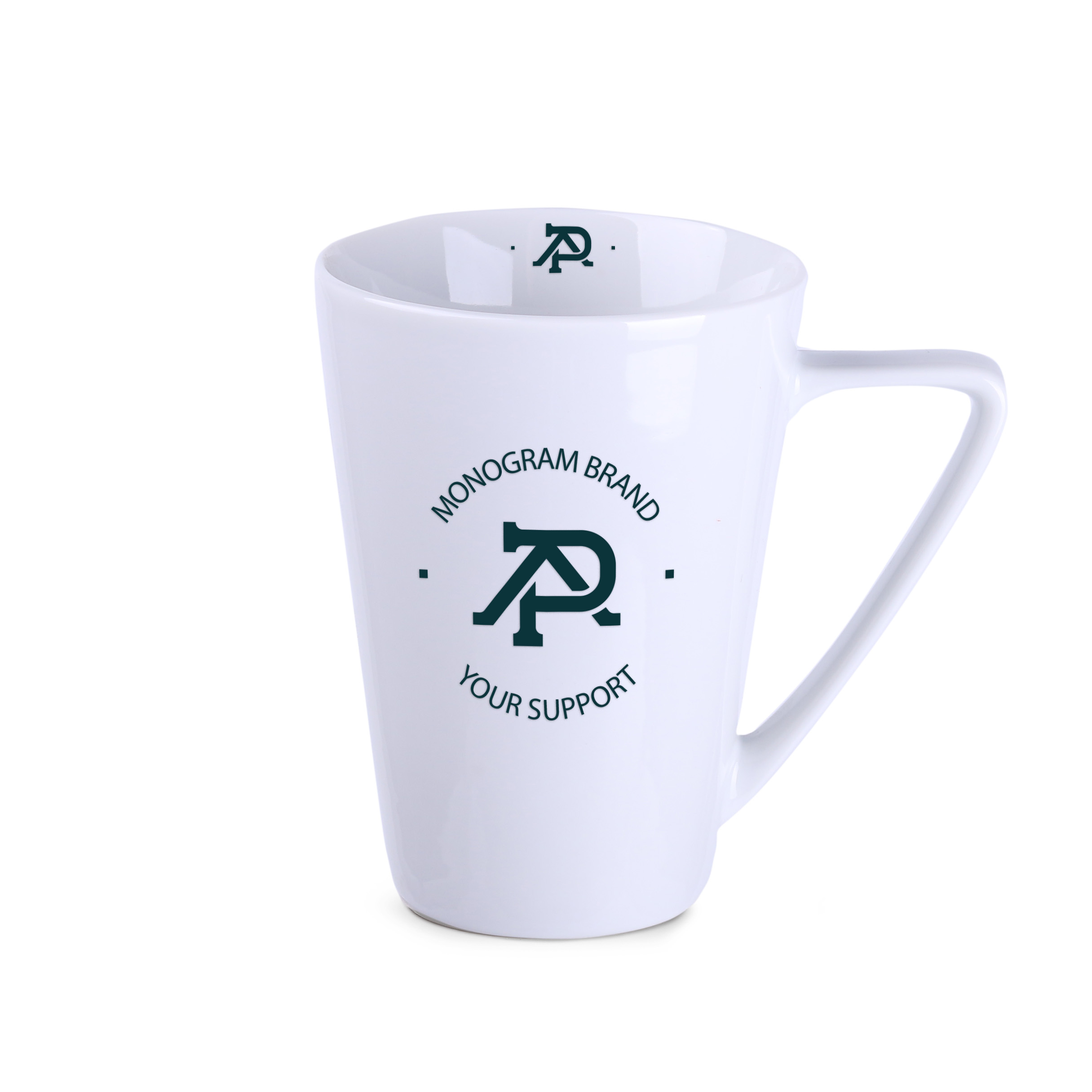 Ruime mok met geometrische vorm van de body en het oor. Gemaakt van hoogwaardig porselein. Ideaal voor het aanbrengen van grote decoraties.