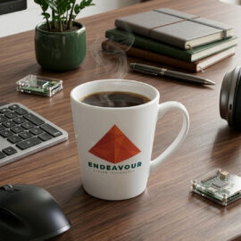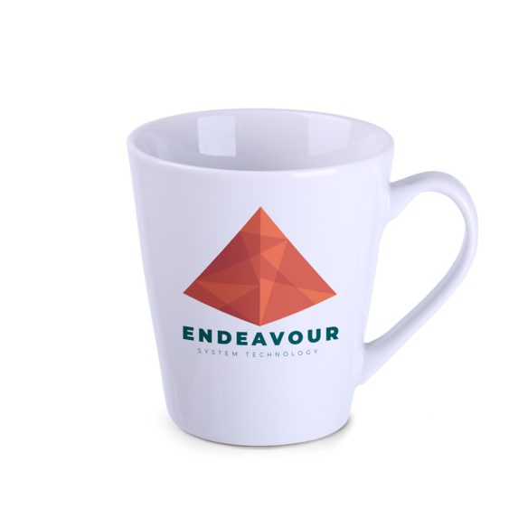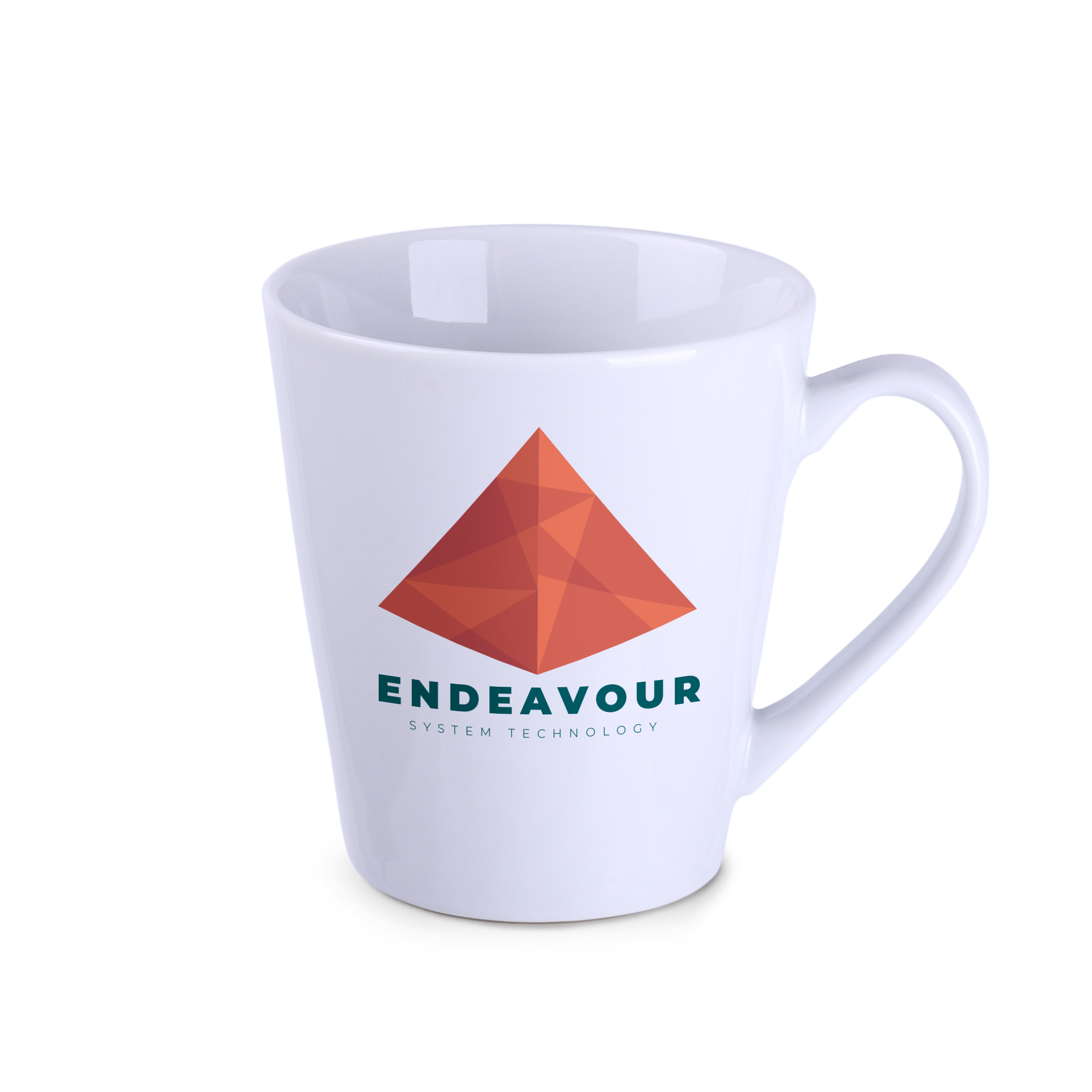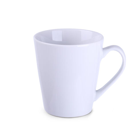 Klassieke mok met trapeziumvorm. Gemaakt van porselein van Europese oorsprong. Heeft een comfortabel, ergonomisch oor. Past perfect bij koffiemachines.