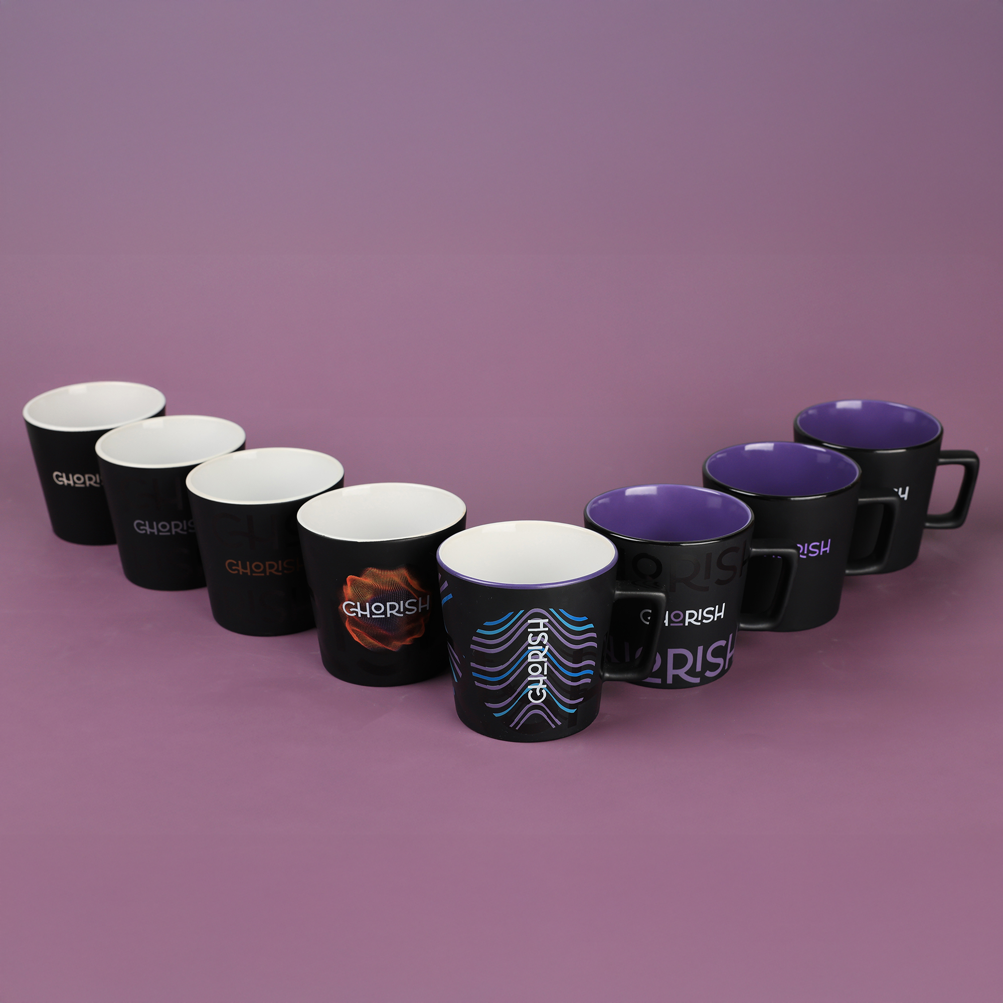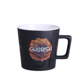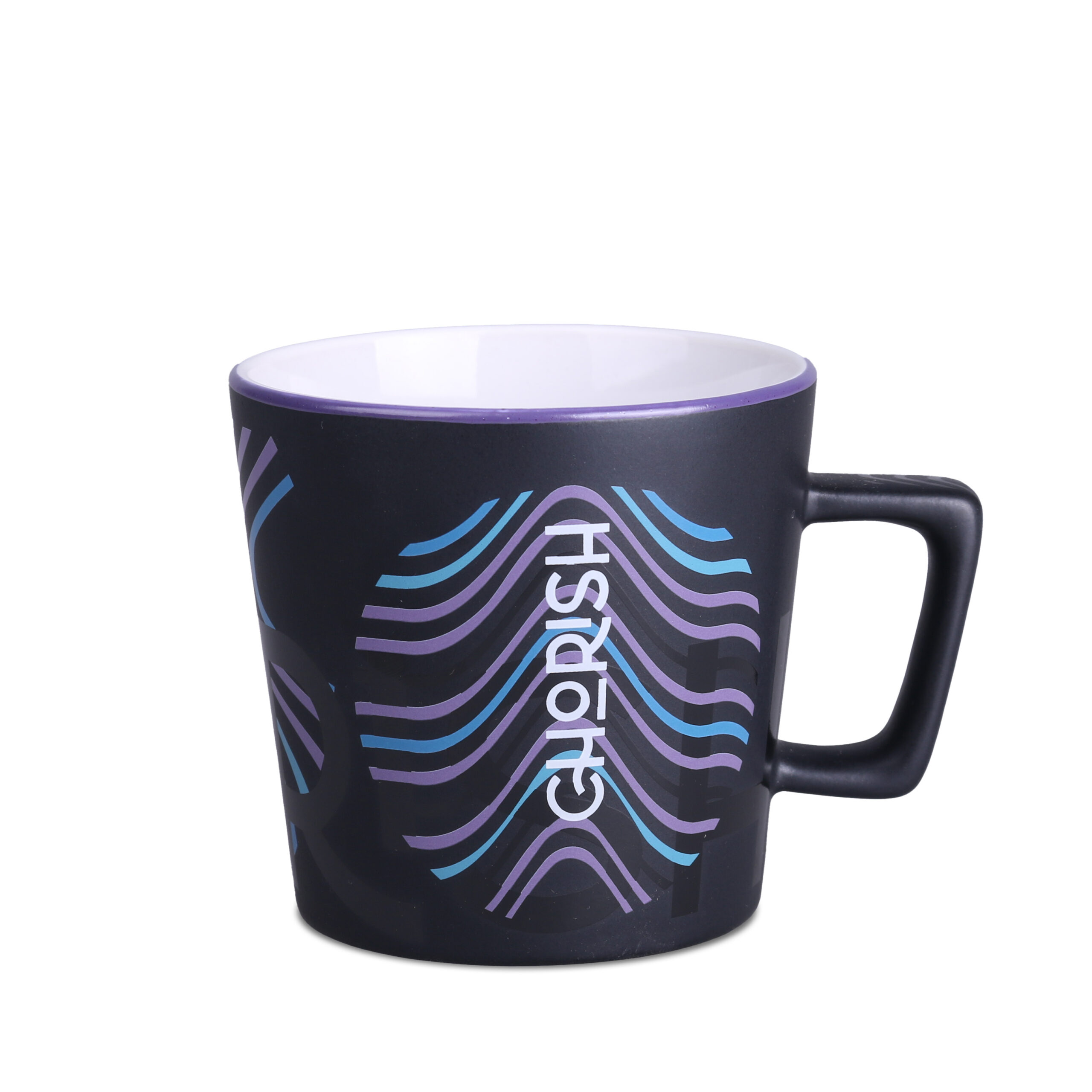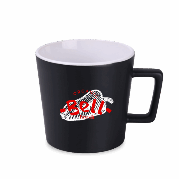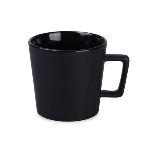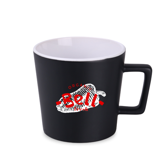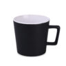 Moderne mok met zwart mat oppervlak. Heeft een oor met een interessante, designer vorm. Heeft een binnenkant in verschillende kleuren.