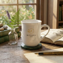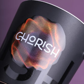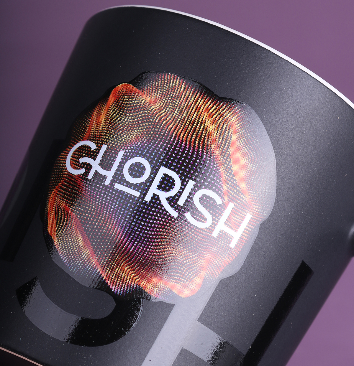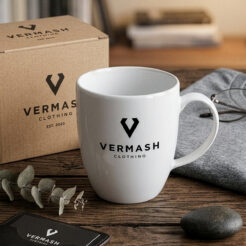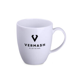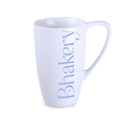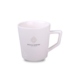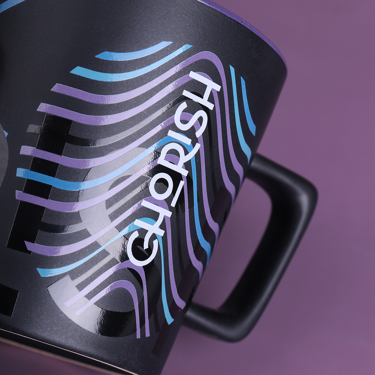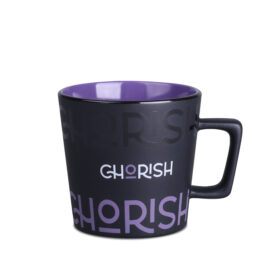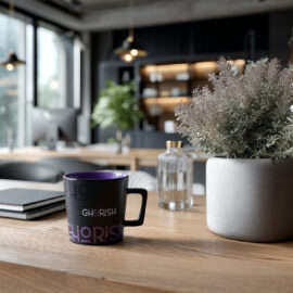 Moderne mok met zwart mat oppervlak. Heeft een oor met een interessante, designer vorm. Heeft een binnenkant in verschillende kleuren.
