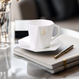 Mooi geometrisch kopje gemaakt van het allerbeste Fine Bone China porselein. Heeft een perfect passend schoteltje. Behoort tot de Prestige Line. Ideaal in duet met de Tiara mok.