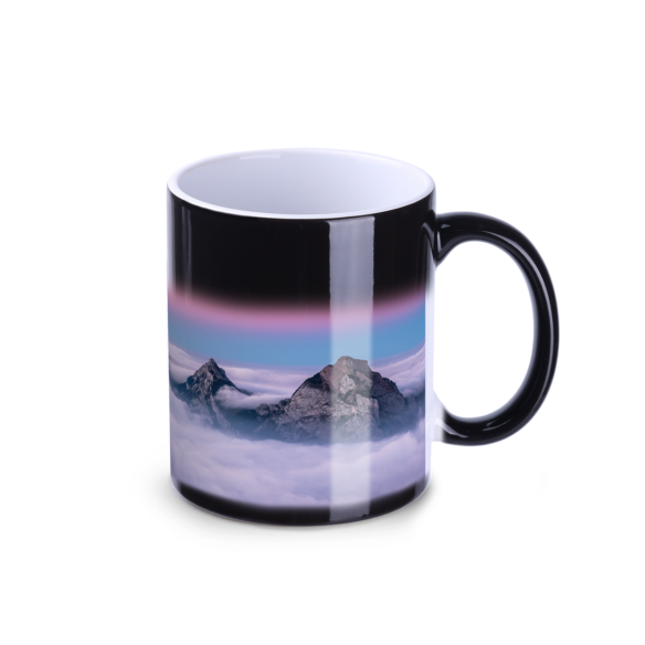 Mok met klassiek design, waarop na het vullen met kokend water op “magische” wijze een bedrukking verschijnt. Bedrukkingen van fotokwaliteit kunnen erop worden aangebracht. Voor wie originele oplossingen waardeert.