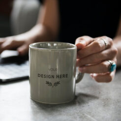 Mok met eenvoudige vorm en interessant oor. Verkrijgbaar in verschillende kleurversies. Ideaal om grote en veeleisende decoraties tentoon te stellen.