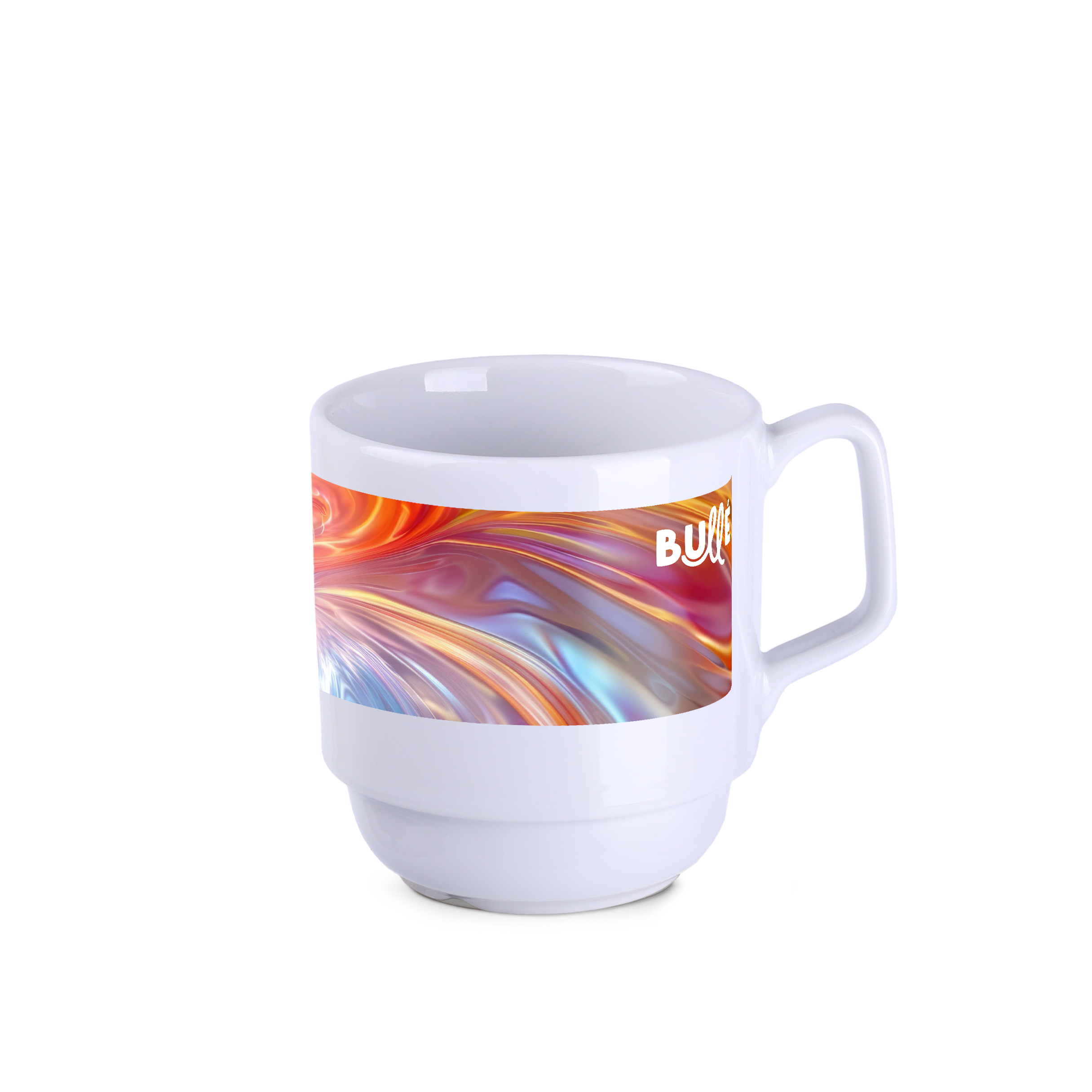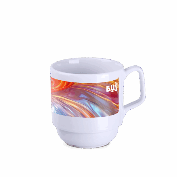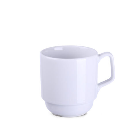 Porseleinen mok met origineel design. De vorm maakt stapelen mogelijk. Heeft speciale kanaaltjes aan de onderkant, waardoor water dat overblijft na het wassen in de vaatwasser kan weglopen. Geproduceerd in Europa.